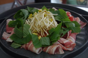 イイダコ、豚肉、エゴマの葉、もやしの最高の組み合わせに、ナム独自で開発した旨辛ダレで炒めていただいて下さい。