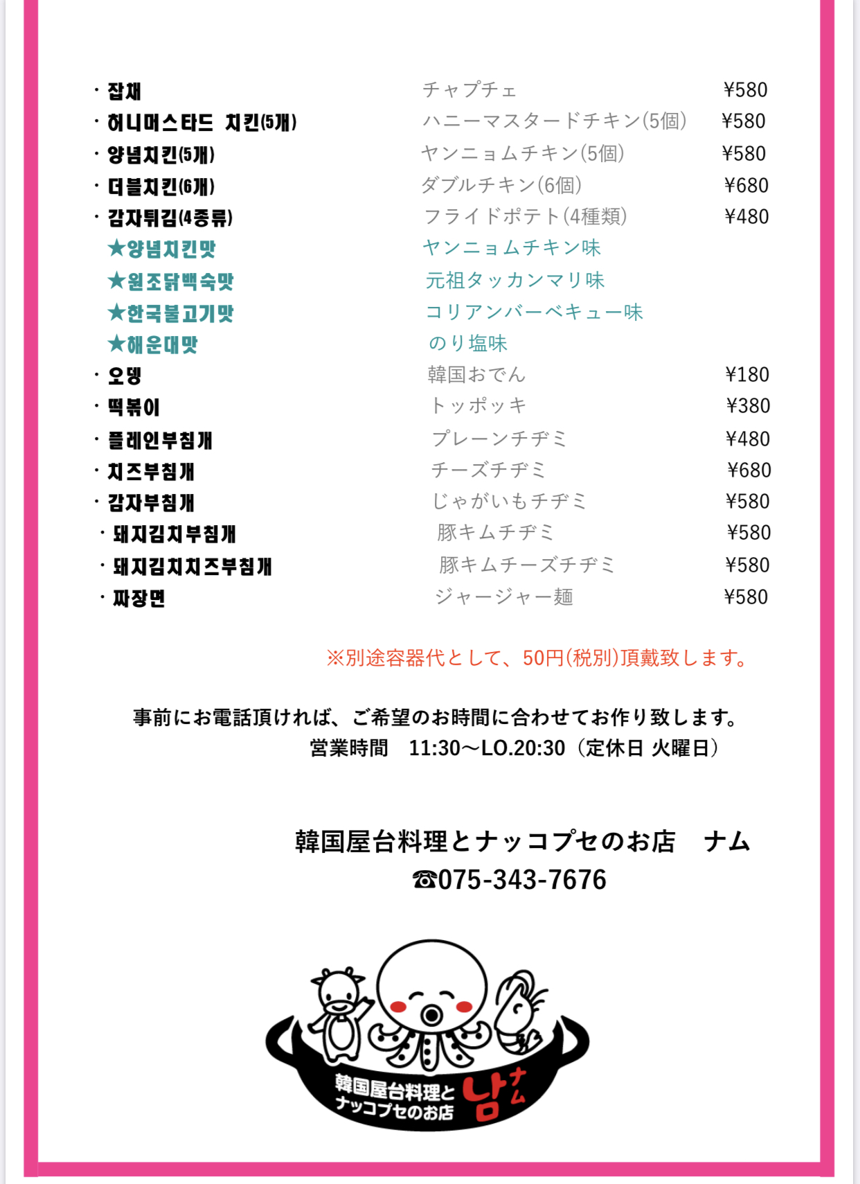 ナムでしか味わえないお料理を、ご自宅、お勤め先でいかがですか?